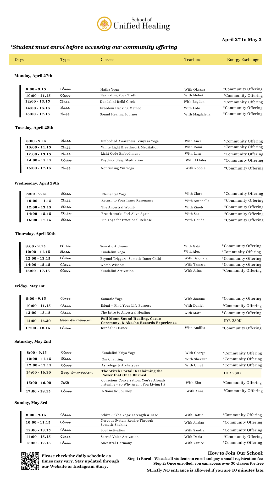 - Ikigai - Find Your Life Purpose with Daniel on Friday at 10 am and will be replaced with Kundalini Activation with Alina.